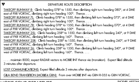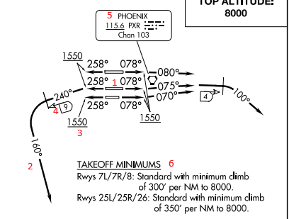For example, if you are taking off at Runway 8, you will take off and fly a heading of 078 to 1550 ft. Then climb to with a right turn heading 080. Once you are 4 DME east of the VORTAC PXR, climb right turn heading 100. Then with a "thence", you look below to find the rest of the instructions.