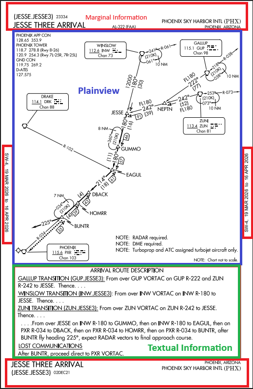 A STAR has three sections similar to a SID (Standard Instrument Departure), the marginal information, plainview, and textual information.