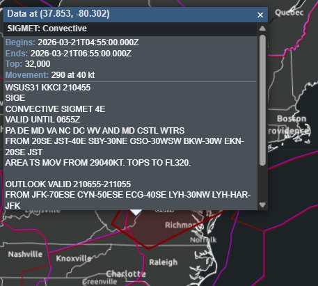 Convective SIGMET are unscheduled in flight advisories that are convective hazardous weathers. It is valid for 2 hours once reported. This is considered the heaviest level advisories a forecaster can give, and in almost all cases, no aircraft should fly through the area.