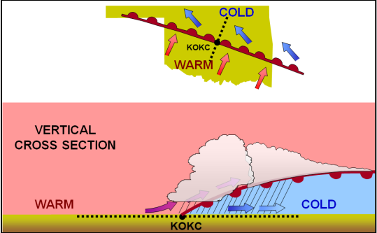 Warm air overrides retreating cold air along a long, gradual slope. Expect widespread low ceilings, poor visibility, drizzle, and serious icing risk. These conditions can linger for hours.