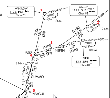For example, if you are taking off at Runway 8, you will take off and fly a heading of 078 to 1550 ft. Then climb to with a right turn heading 080. Once you are 4 DME east of the VORTAC PXR, climb right turn heading 100. Then with a "thence", you look below to find the rest of the instructions.