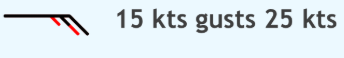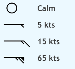 A combination of long/short barbs and pennants indicate the speed of the wind in station weather plots rounded to the nearest 5 knots. Calm wind is indicated by a large circle drawn around the skycover symbol.